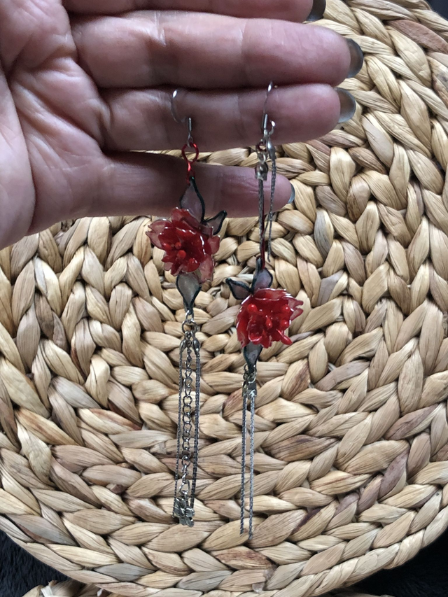 3. 🧵 Matières : Résine rouge et argentée, chaînette acier inoxydable, métal structuré (fleur faite main)