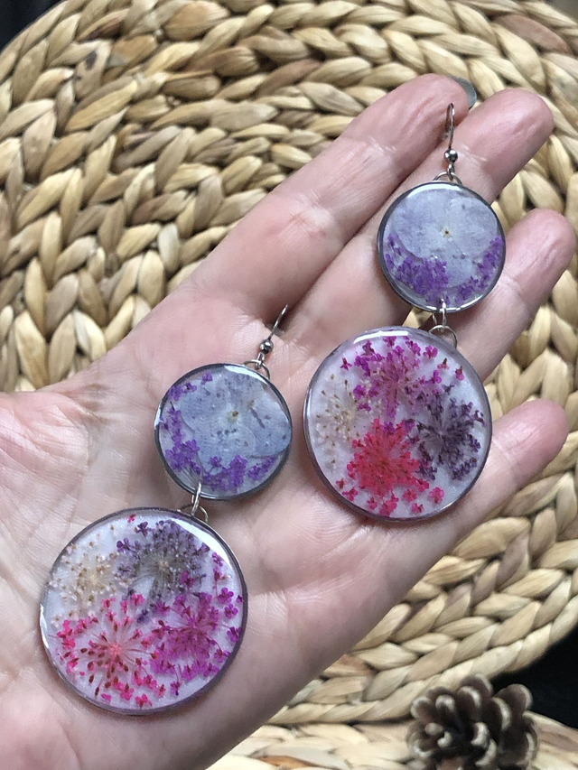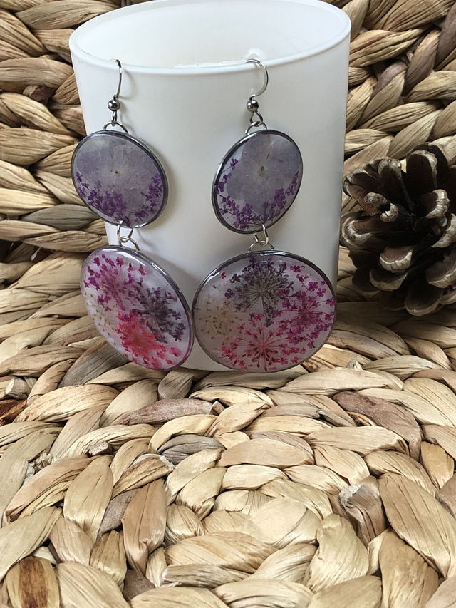 La résine blanche met en valeur de délicates fleurs roses et violettes, évoquant la douceur, la tendresse et la féminité. Les cercles apportent équilibre et structure, créant un contraste harmonieux. Ces boucles accompagnent chaque mouvement avec grâce et poésie, révélant la lumière et la singularité de celle qui les porte.