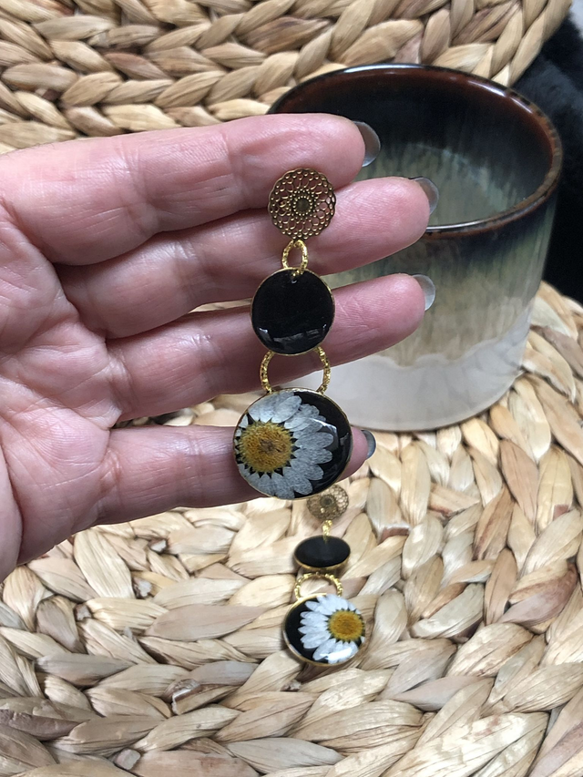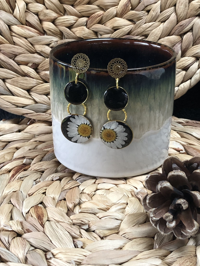 La résine noire apporte profondeur et mystère, tandis que la marguerite évoque douceur, innocence et poésie. Les cercles et puces dorés ajoutent éclat et équilibre, créant un contraste subtil et raffiné. Ces boucles accompagnent chaque geste avec légèreté et élégance, révélant la singularité et la féminité de celle qui les porte.