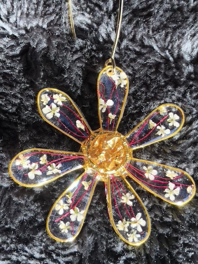 🧵 Matières : résine, tiges rouges et petites fleurs blanches, forme marguerite entièrement façonnée à la main
