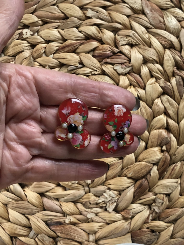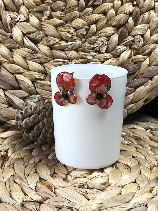La résine rouge met en valeur le motif floral, symbole de poésie et de vitalité. Les perles blanches et strass noirs apportent contraste et éclat, tandis que les puces d'oreilles assurent confort et maintien. Ces boucles révèlent féminité, audace et délicatesse dans chaque geste.