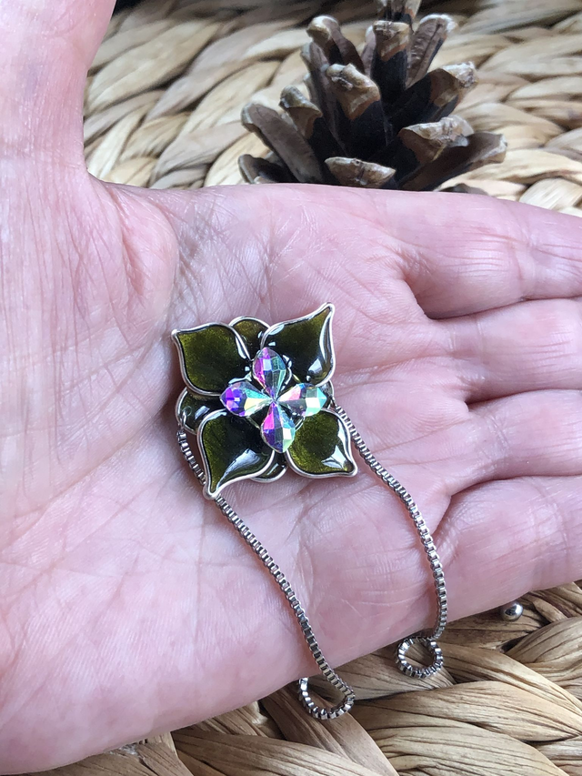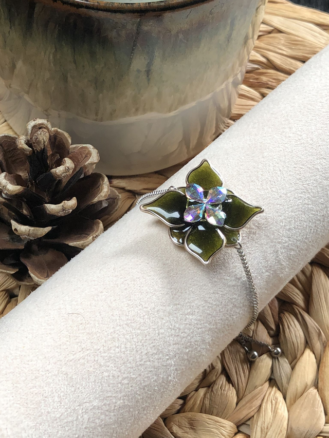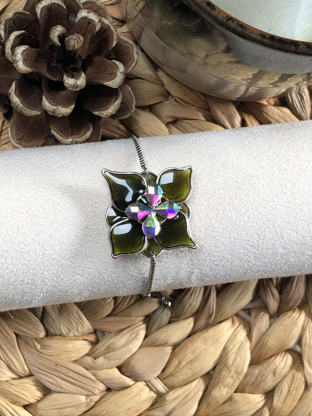 La résine kaki et dorée évoque la nature et la lumière, tandis que les cercles en acier inoxydable apportent équilibre et structure. Les strass multicolores captent l’éclat de chaque mouvement, et la fleur entièrement faite main diffuse poésie et douceur. Ce bracelet incarne harmonie, énergie et féminité bohème.