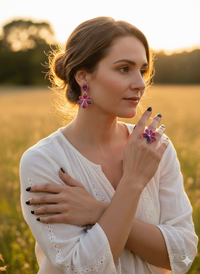 Cette parure s’adresse à une femme créative, douce et expressive, attirée par les couleurs vibrantes et les bijoux qui racontent une histoire. Elle aime les pièces artistiques qui révèlent sa sensibilité et son originalité. Elle la porte comme une affirmation de sa féminité lumineuse, pour se sentir belle, confiante et singulière, au quotidien comme lors de moments plus symboliques ou précieux.