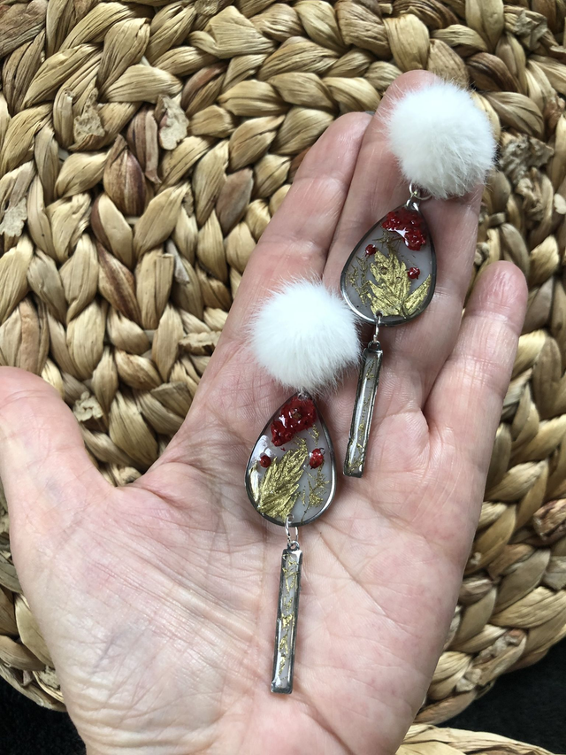 Boucles d'oreilles Cocoon - pompon blanc, fleurs rouges et feuilles dorées