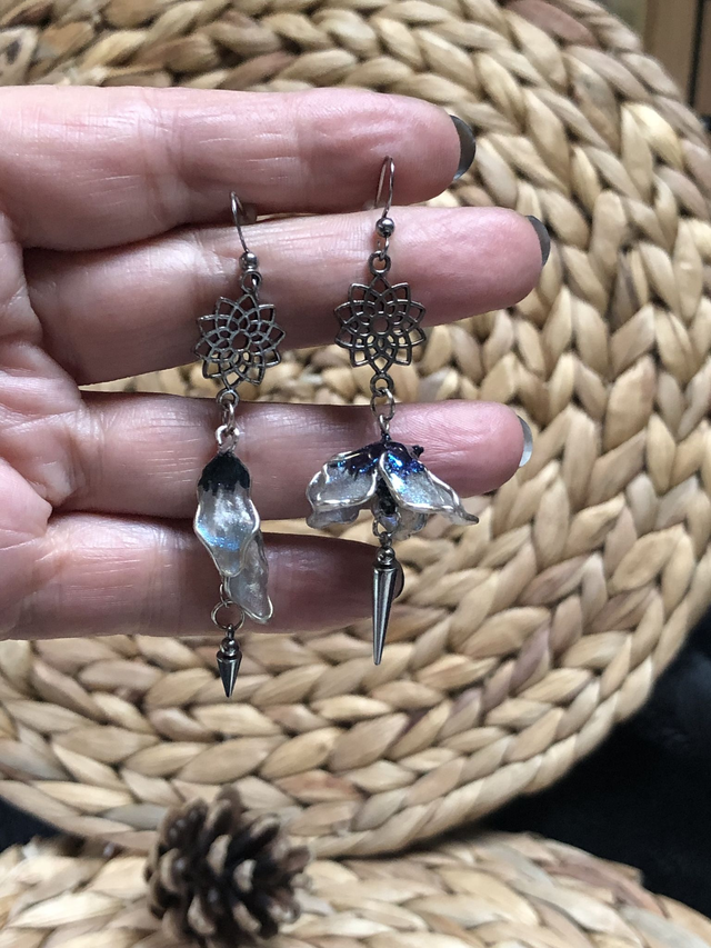 Le contraste du noir et blanc crée un équilibre puissant entre force et douceur. Les reflets caméléon bleutés apportent une touche de mystère et de lumière changeante. L’asymétrie évoque la liberté, la créativité et l’harmonie dans la différence. Ces boucles faites main incarnent une féminité moderne, intuitive et singulière.