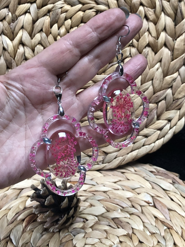 - 🧵 Matières : Résine transparente, fleurs roses intégrées, crochets acier inoxydable