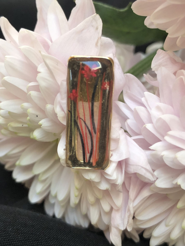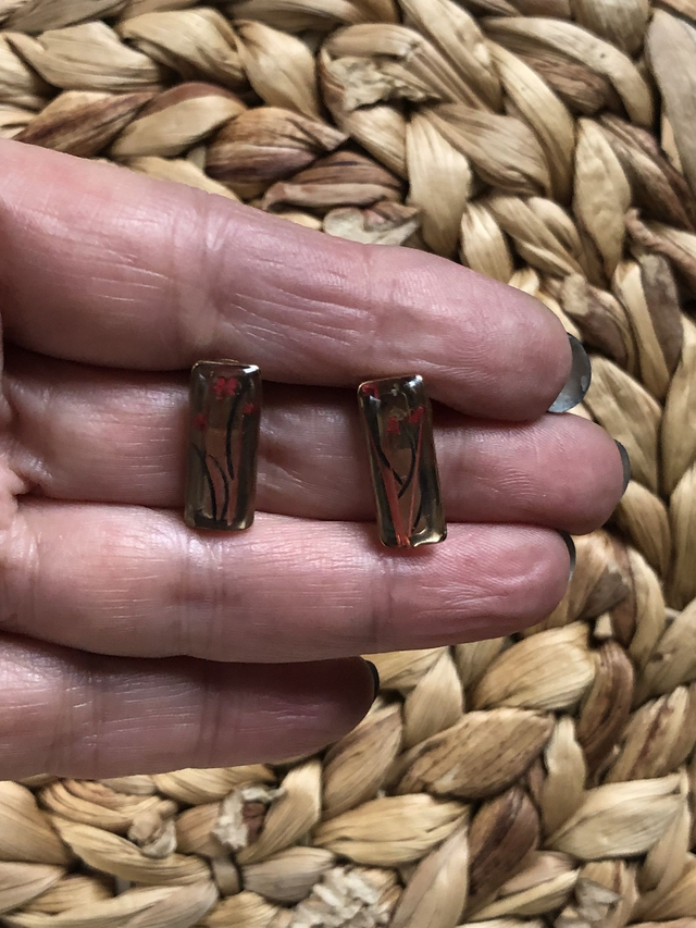 La résine transparente met en valeur les fleurs rouges et les filaments noirs et rouges, apportant profondeur et dynamisme. Le rectangle doré ajoute lumière et structure. Ces boucles, délicates et travaillées, révèlent féminité, poésie et caractère.