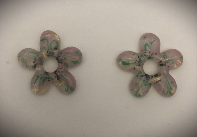 Ces pièces en résine représentent deux marguerites stylisées à cinq pétales. Leur forme arrondie, douce et parfaitement équilibrée leur donne un aspect à la fois moderne, floral et fantaisie.